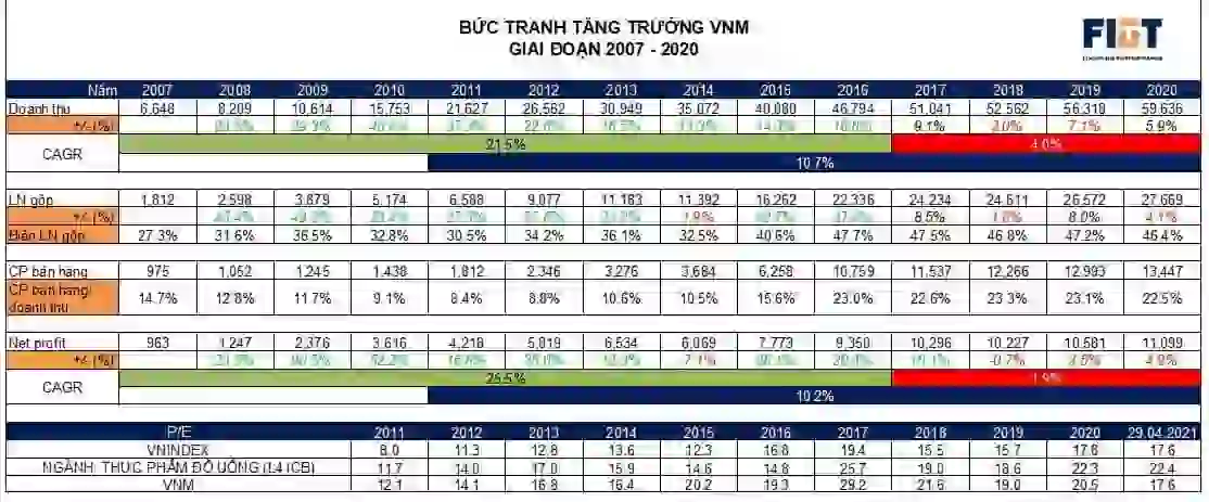 Nhìn vào bảng kiểm kê được tăng lên khoảng thời gian từ 2007 đến 2016 để thấy giai đoạn vàng son của vinamilk đã trôi qua. Trong khoảng thời gian này, xét về doanh số, mức phát triển trung bình cagr bình quân của vnm lên đến 21. 5% và mức triệt để tăng gần 8 lần.